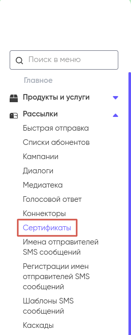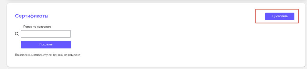 Для того что бы загрузить сертификат в систему, в личном кабинете перейдите в раздел «Сертификаты» и нажмите «+ Добавить».