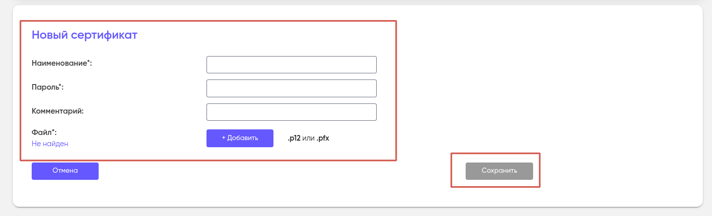 В открывшейся форме заполните поля Наименование (произвольное), Пароль (для авторизации при отправке запроса во внешнюю систему), Комментарий (по желанию) и прикрепите Файл сертификата в формате .p12 или .pfx.