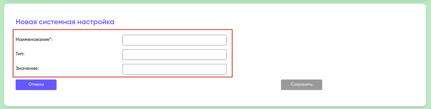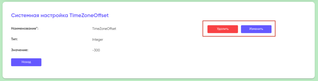 Что бы удалить/изменить «Наименование», «Тип» и/или «Значение», нажмите на него в списке системных настроек и внесите требуемые изменения в открывшемся окне.