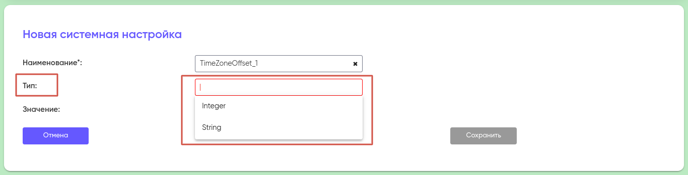 • Тип (обязательное поле) — формат данных, который может быть либо Integer (целое число), либо String (строка), в зависимости от используемой настройки:
