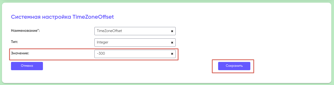 TimeZoneOffsetInteger/StringInteger — «-300» указывает на смещение часового пояса в минутах;