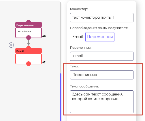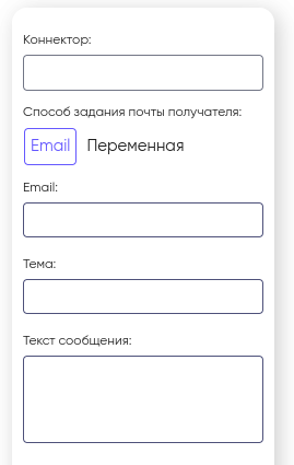 Блок Email используется для отправки писем. Он включает в себя следующие основные компоненты: коннектор SMTP, поле Email, Тема и Текст письма.