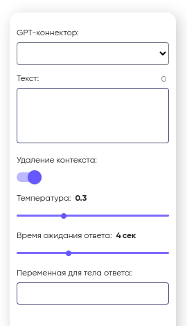 Он включает в себя следующие основные компоненты: GPT—коннектор, GPT-промпт, поле Текст, Удаление контекста, Температура, Время ожидания ответа, Переменная для тела ответа.