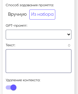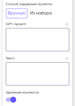 Поле GPT-промпт. В этом поле пользователь может вручную задать промпт для модели GPT. Промпт — это инструкция, которую получает модель для генерации ответа.
