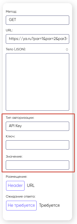 Для типа авторизации API key нужно задать Ключ и Значение, а также в Размещение выбрать как имеенно передавать данные: