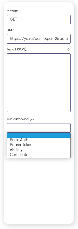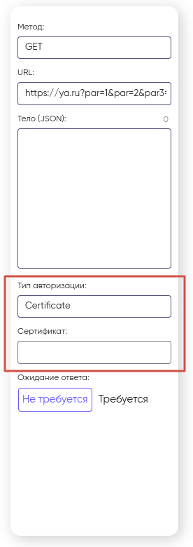 Обратите внимание, что при указании типа авторизации Certificate вам потребуется выбрать конкретный сертификат в выпадающем списке «Сертификат». Для того, что бы сертификат появился в данном списке, необходимо предварительно загрузить ваш файл сертификата в личном кабинете пользователя. Как это сделать, смотрите в разделе Личный кабинет Сертификаты .
