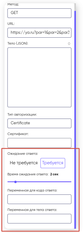Следующим шагом укажите параметры ожидания ответа от стороннего HTTP-сервера. Если требуется ожидание ответа, то переключитесь на соответствующее значение “Требуется”. Настройте время ожидания ответа и укажите в какую переменную будут положены код и тело ответа:
