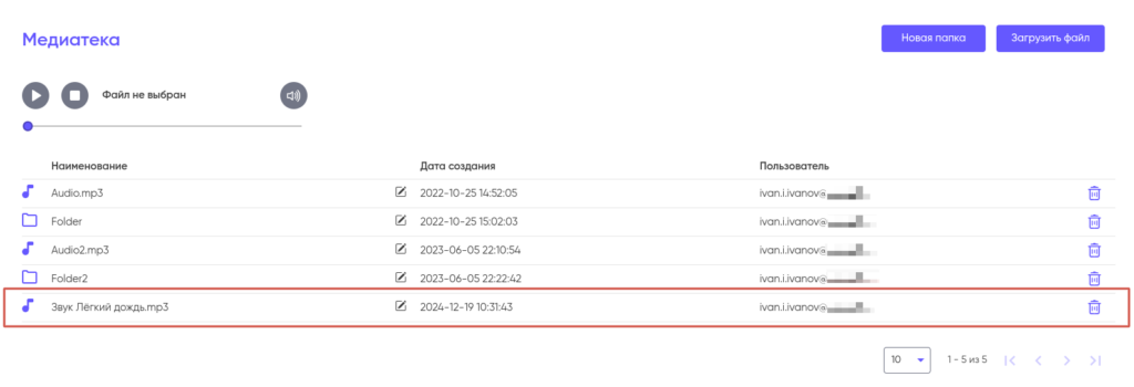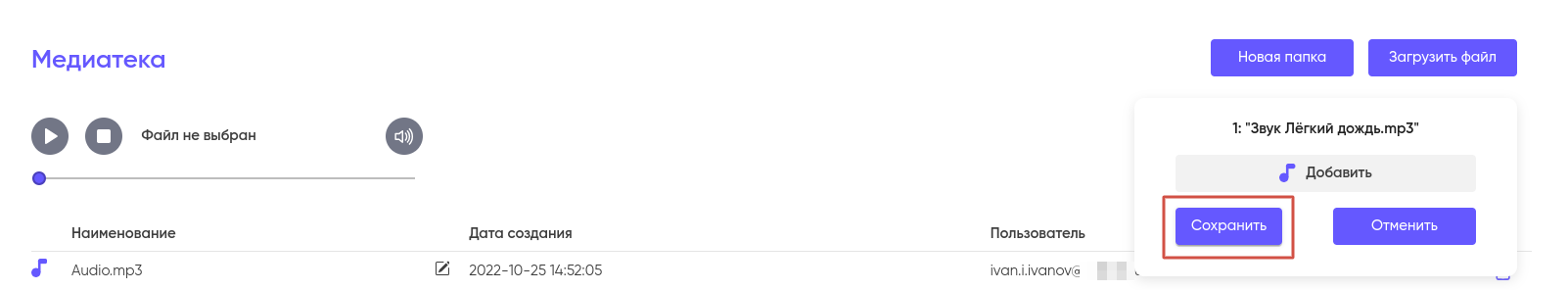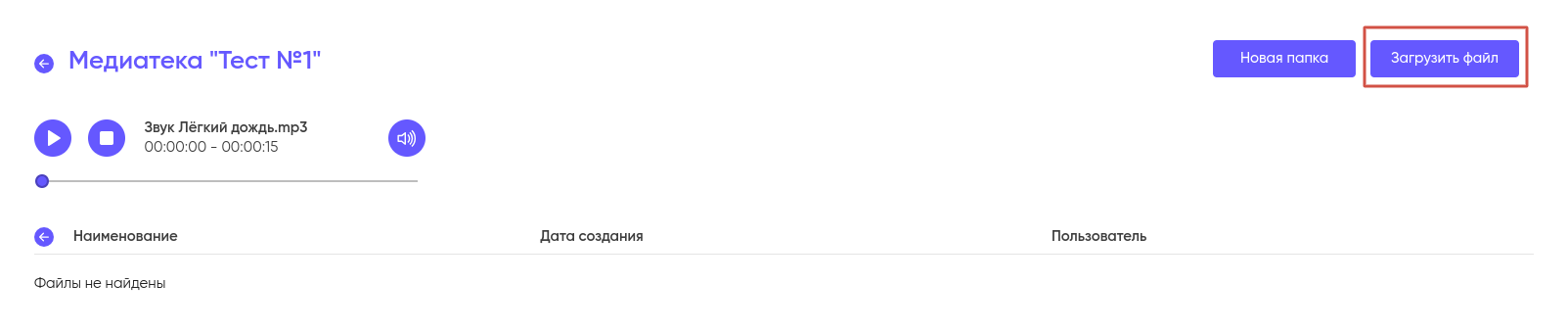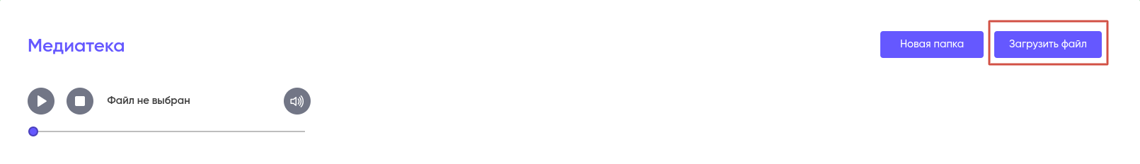 Для того, что бы загрузить файл в Медиатеку, нажмите на кнопку “Загрузить файл” в правом верхнем углу экрана.