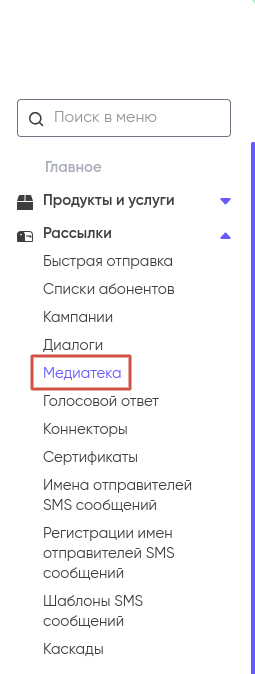 Для перехода в Медиатеку, нажмите на одноименный пункт в разделе “Рассылки” в основном меню личного кабинета.
