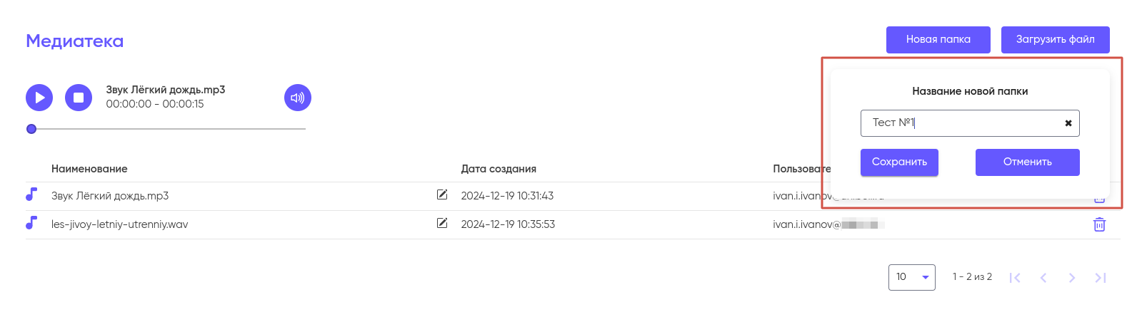 Для создания папки нажмите на кнопку “Новая папка” в правом верхнем углу экрана. После чего введите для нее имя и нажмите “Сохранить”.