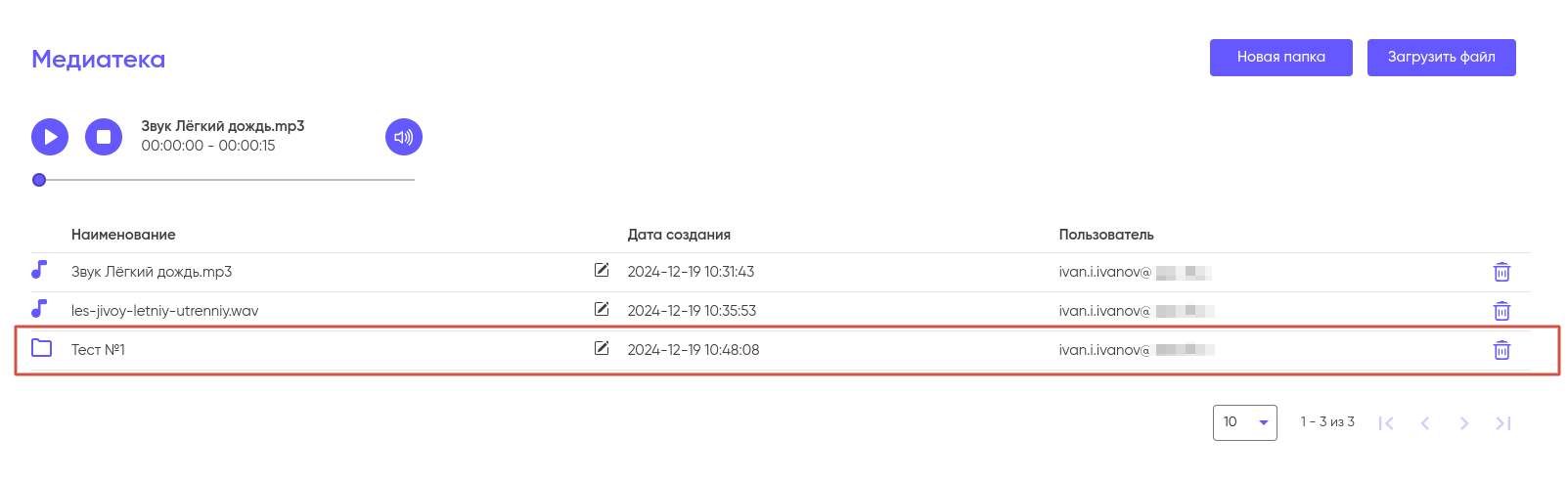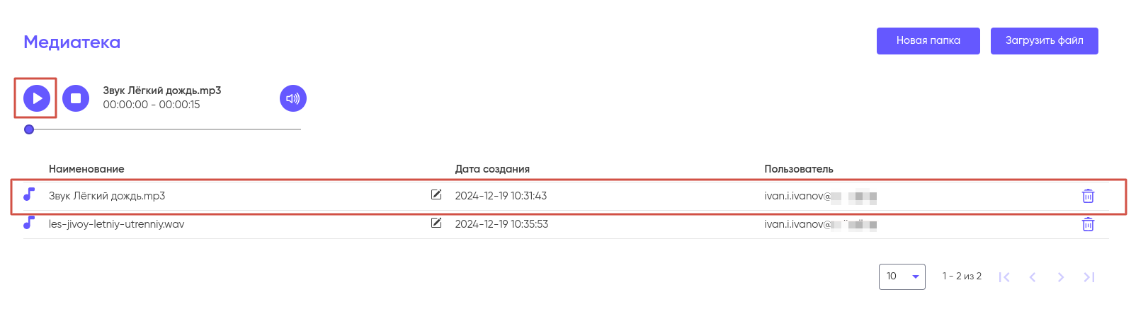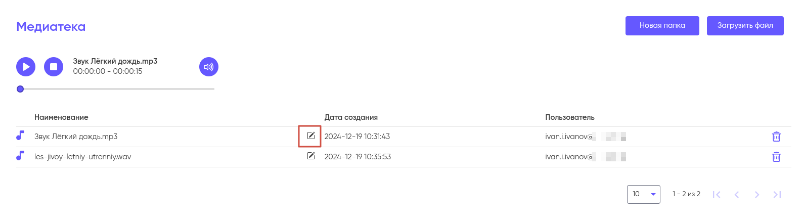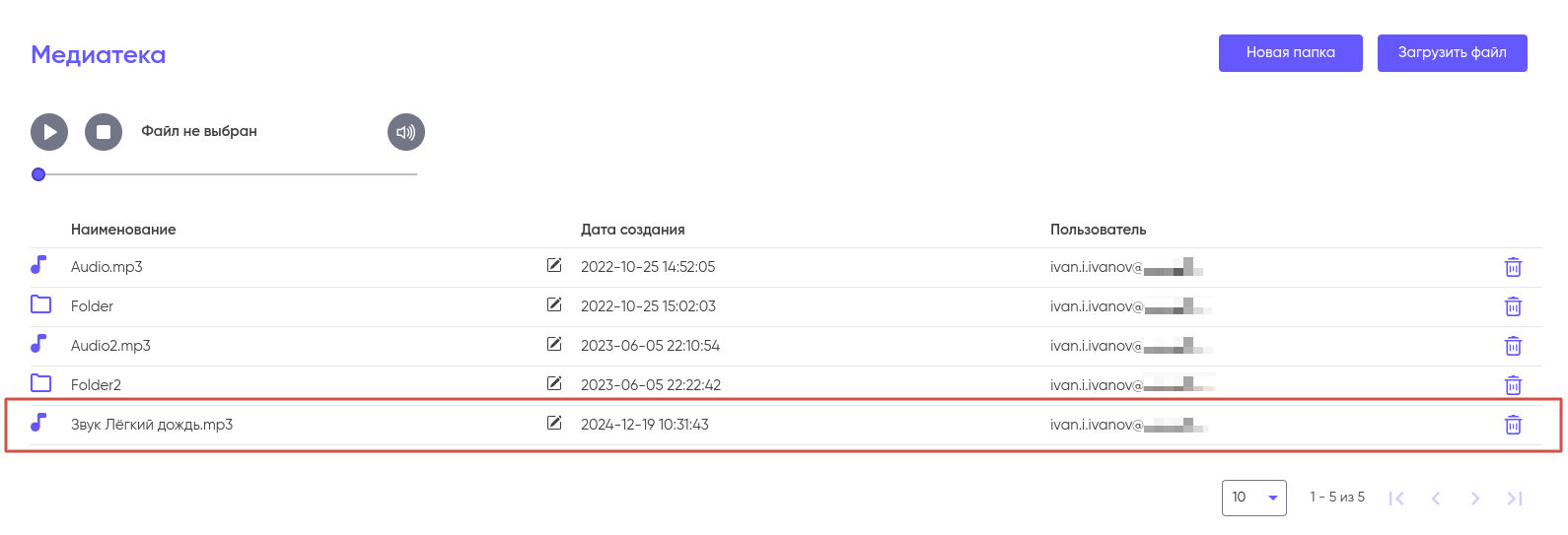 Для того, что бы удалить файл из Медиатеки нажмите на иконку корзины и подтвердите удаление.