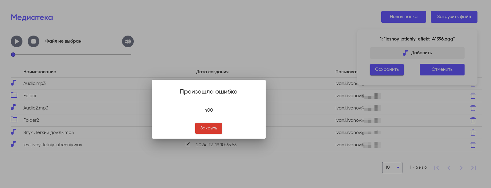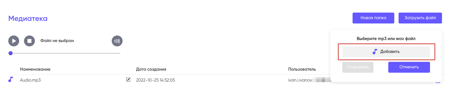 Обратите внимание, что система загружает и работает только с файлами в формате MP3 и WAV. При попытке загрузить файл в ином формате система выдаст ошибку.