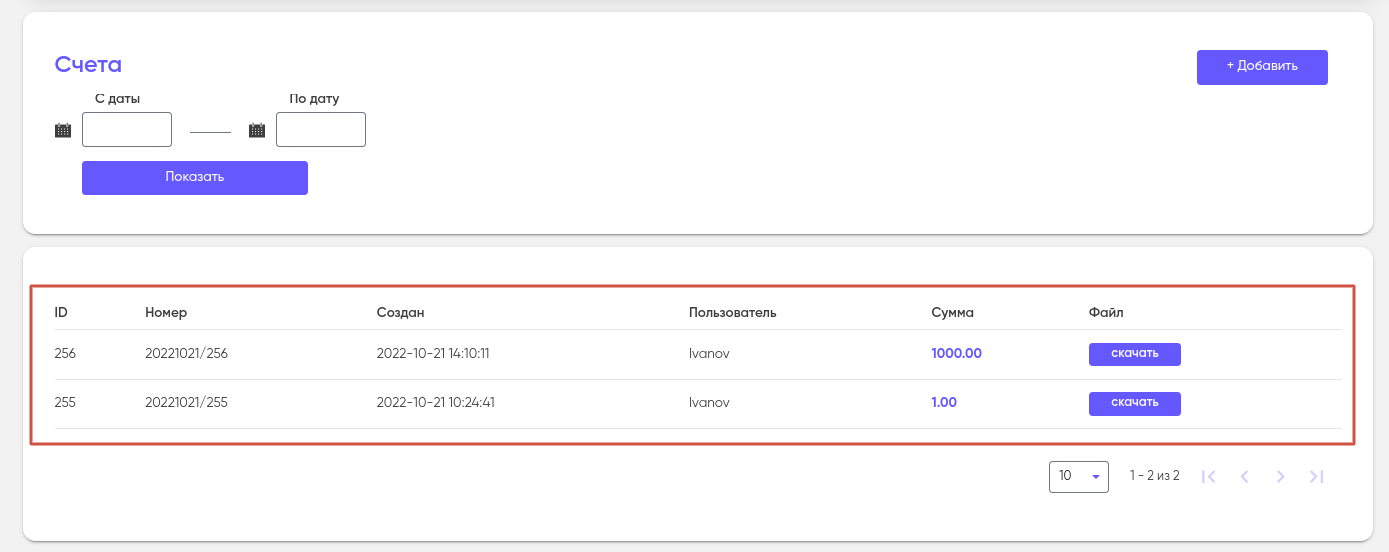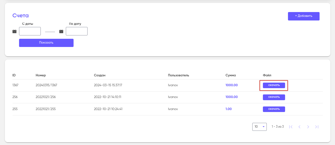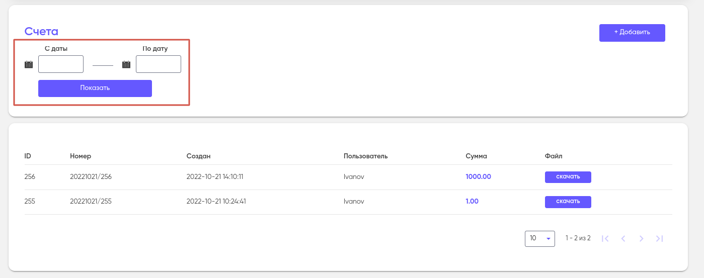 Для быстрого поиска нужного счета, воспользуйтесь фильтром “С даты — По дату” вверху страницы.