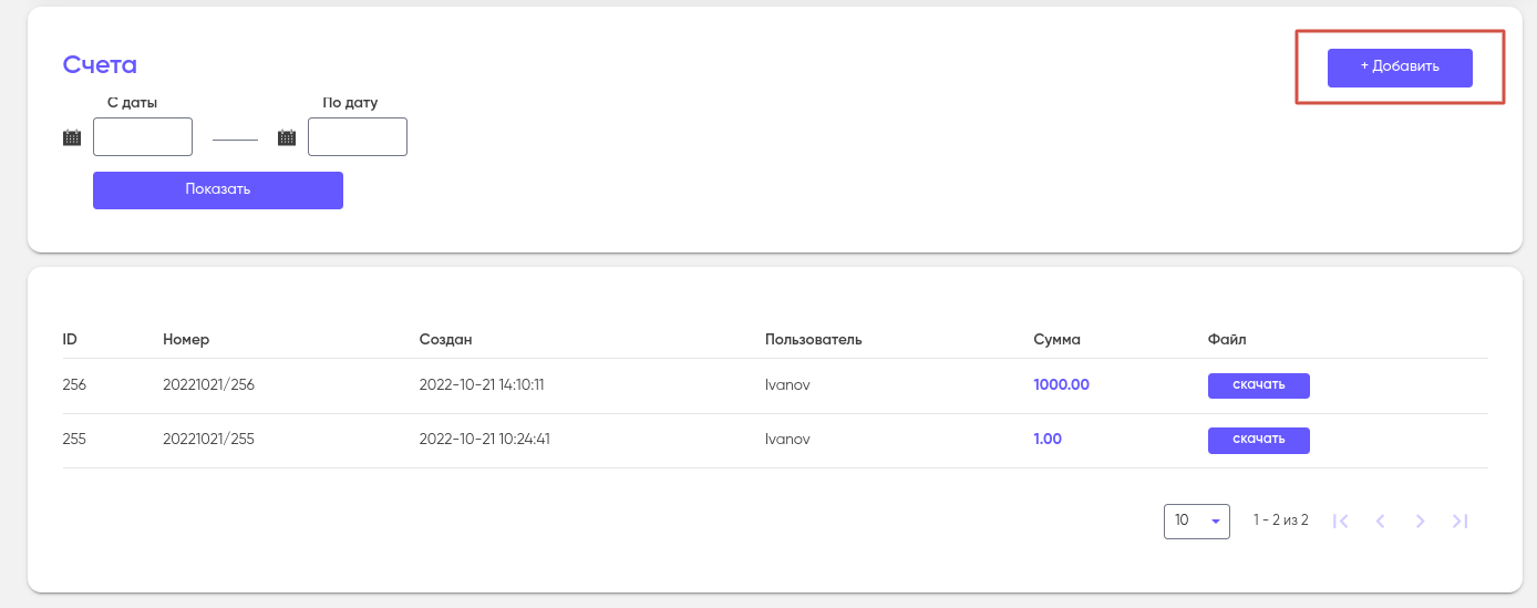 Для выставления счета на оплату нажмите на кнопку “Добавить” в правом верхнем углу страницы.