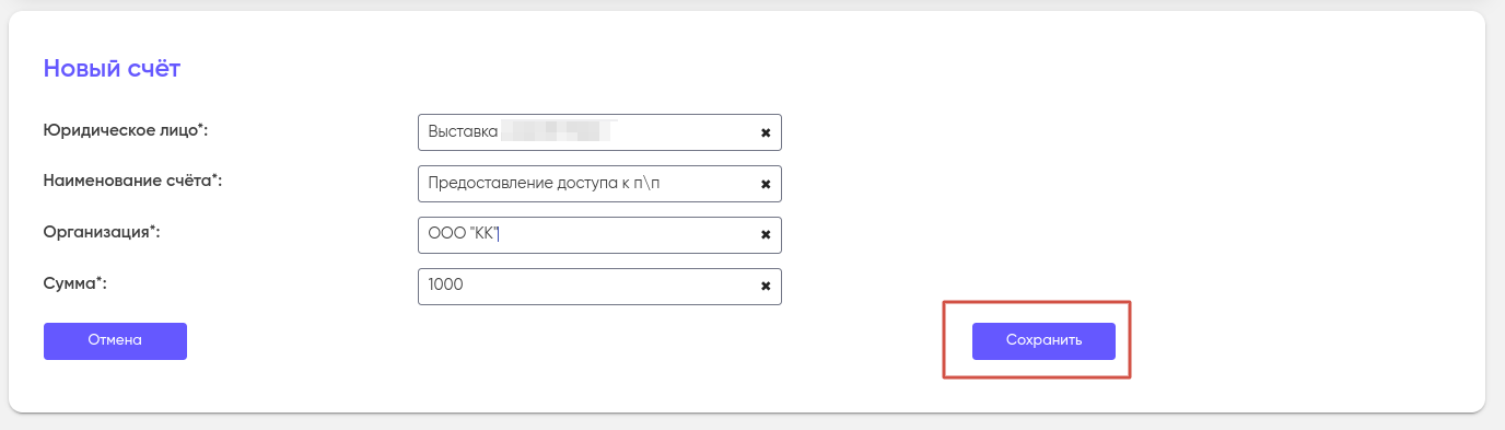 - Наименование счёта (из выпадающего списка выберите вид услуги, за которую будет выставлен счет);