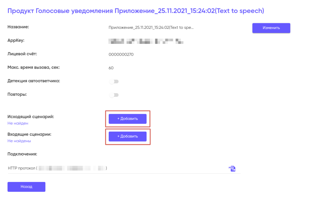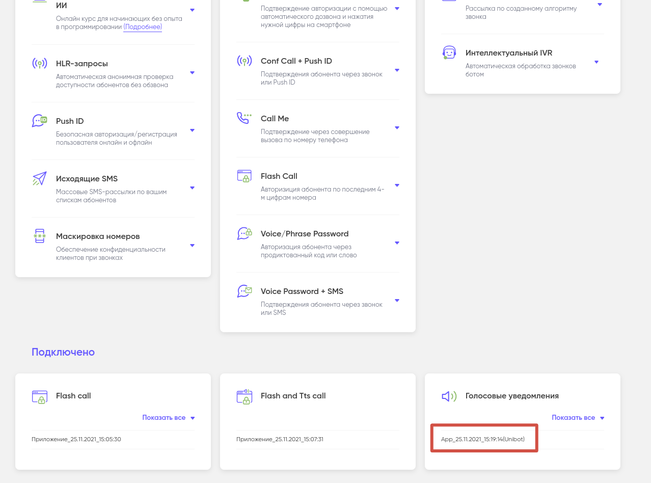 Для доступа к конструктору перейдите из раздела “Продукты и услуги” (начальный экран личного кабинета) в карточку приложения, нажав на “Голосовое уведомление”.