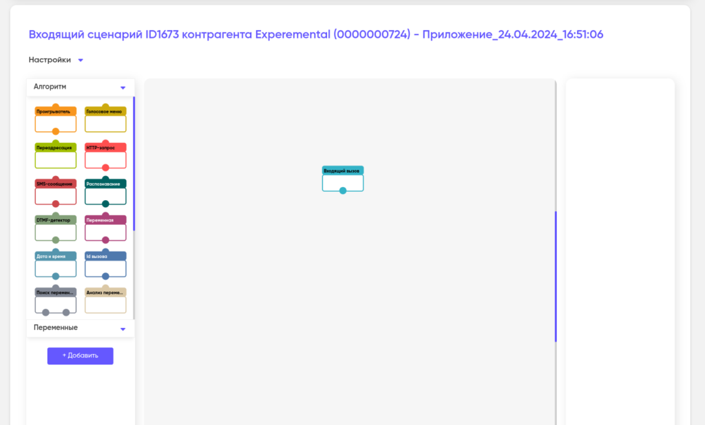 Блок «Входящий вызов» или «Исходящий вызов» (в зависимости от типа сценария) всегда находится внутри области конструирования и служит якорем, от которого начинается отрисовка сценария.
