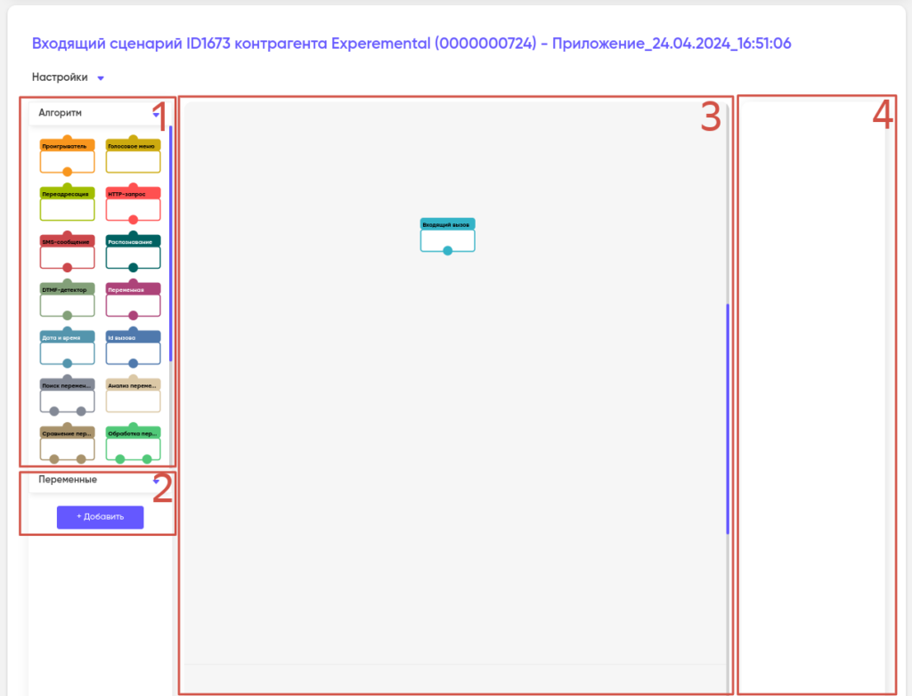 Рабочая зона конструктора сценариев состоит из нескольких областей:
