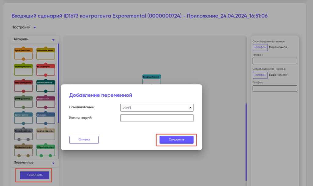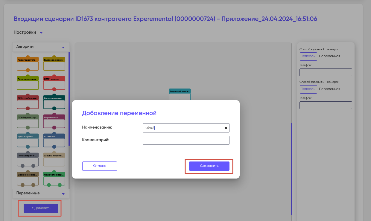 Переменная в сценарии — это абстрактная ссылка на какое-либо сохраненное данное (значение). Значение переменной может присваиваться ей при создании сценария или поступать извне, например из файла со списком абонентов или непосредственно из звонка.