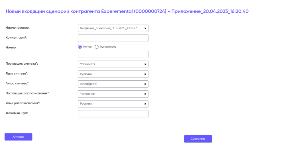 При создании исходящего сценария придумайте название и введите его в поле «Наименование» (максимум 45 символов). Поле «Комментарий» можно оставить пустым. По умолчанию доступны выбор поставщика, языка и голоса синтеза, поставщика и языка распознавания, а также фоновый шум. Эти настройки можно изменить по вашему усмотрению.