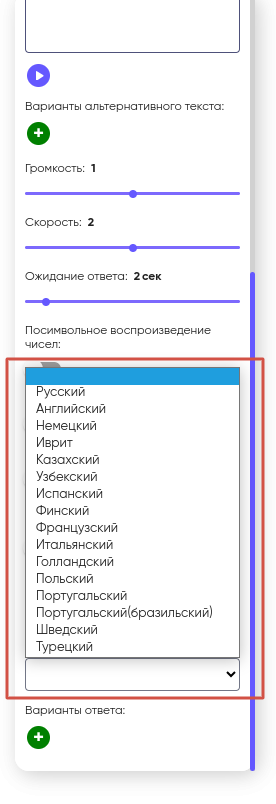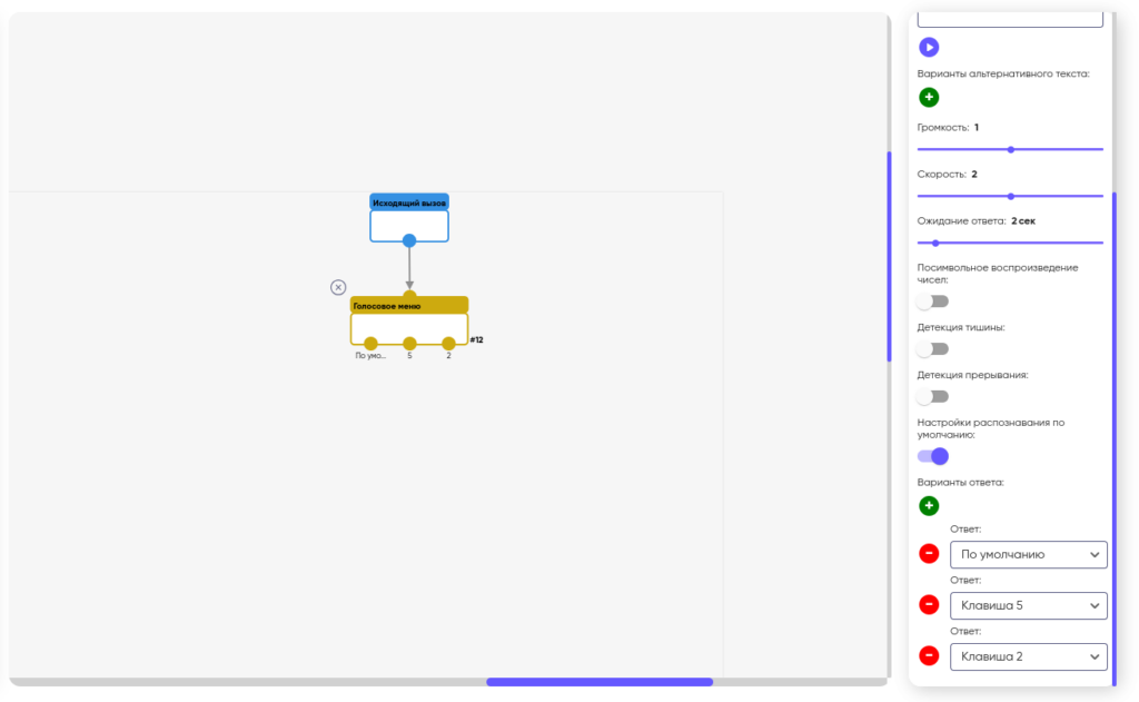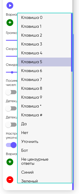 При нажатии на поле “Ответ” раскроется список с вариантами ответа. В качестве вариантов ответа могут быть назначены клавиши телефона, а также Голосовые ответы абонента.