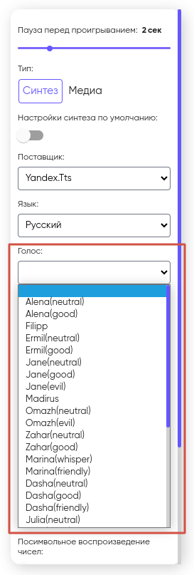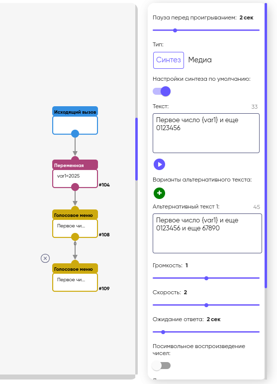 Кроме того, поддерживается озвучка чисел как из переменной, так и через ввод цифр в блок голосового меню.