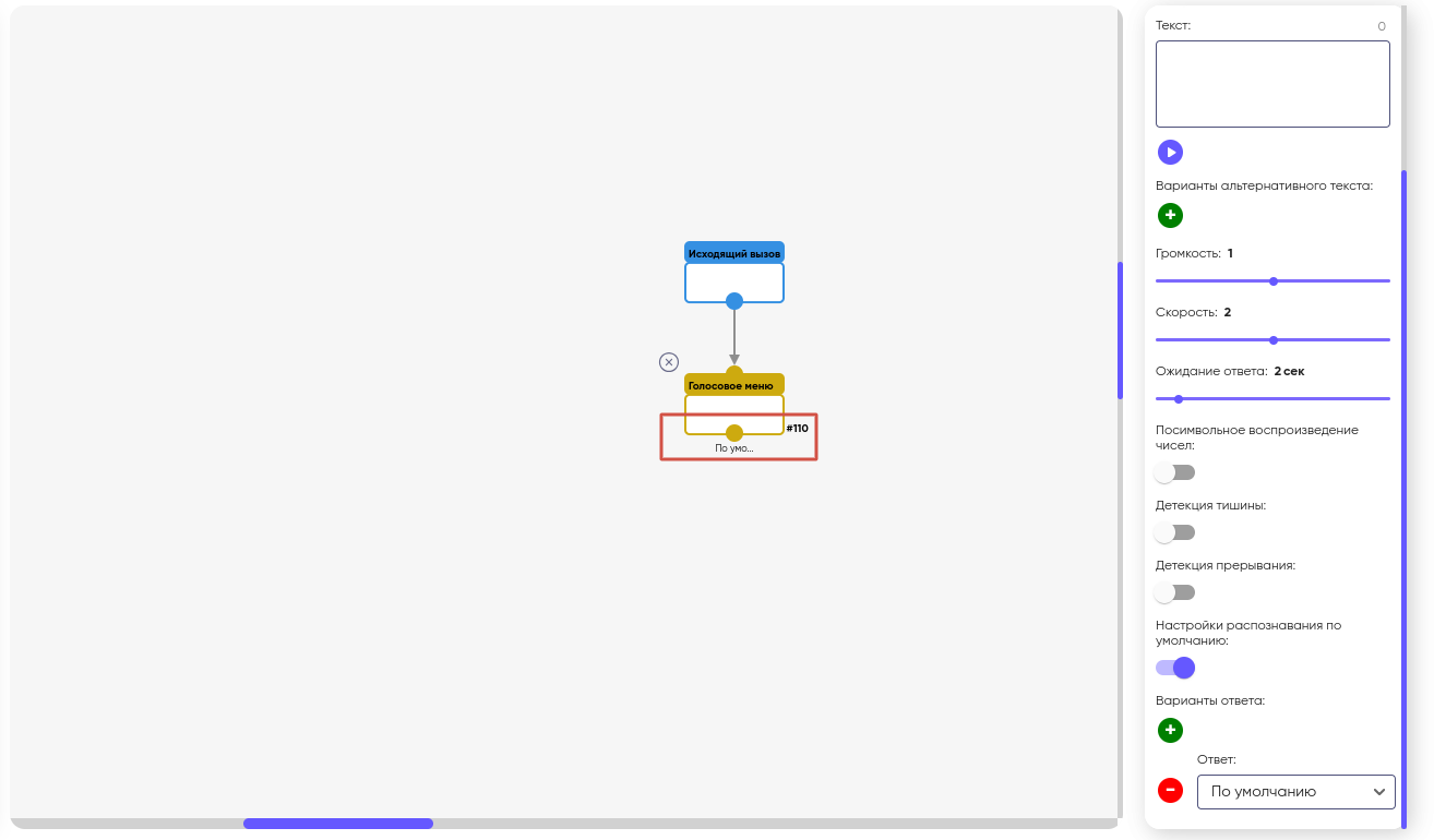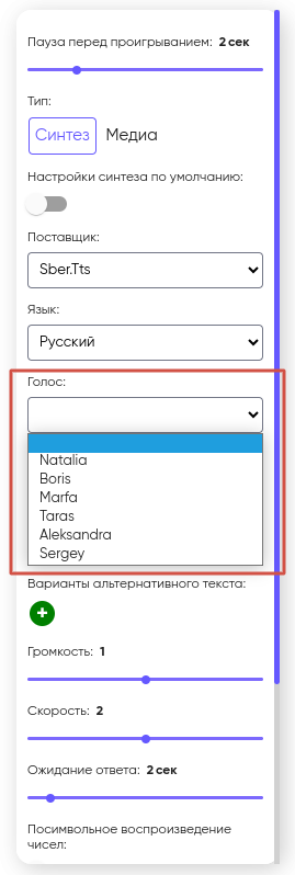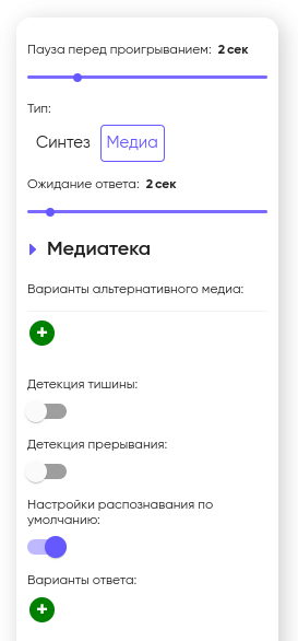 После настроек типа Синтез/Медиа в свойствах блока “Голосовое меню” расположен параметр “Ожидание ответа” (по умолчанию 2 секунды). Данный параметр отвечает за то, сколько времени система будет ожидать ответ абонента, после того как робот закончит проговаривать текст или закончится проигрывание аудиофайла.