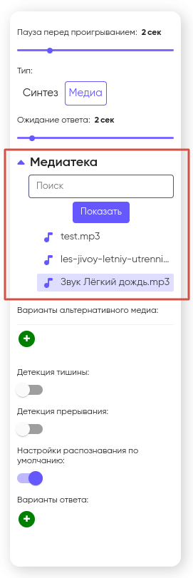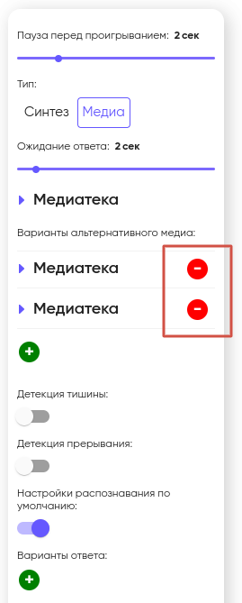 В некоторых сценариях может возникнуть необходимость, чтобы система случайным образом выбирала медиа для воспроизведения. В таких случаях используется функция «Варианты альтернативного медиа». С ее помощью вы можете добавить несколько различных медиафайлов для робота, нажав на «+».