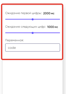 В свойствах блока можно настроить время ожидания ввода первой цифры (2000 мс по умолчанию), а также время ожидания последующих цифр (1000 мс по умолчанию) и указать переменную, в которую будет сохранен результат ввода.